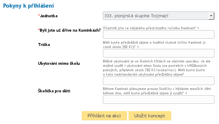 Na detailu akce v Přihlašovně najděte část s přihlášením. Zde je třeba vyplnit několik údajů, které nám pomůžou s přípravou akce.